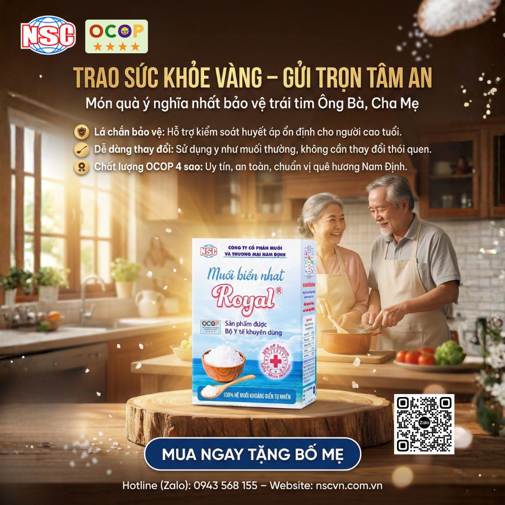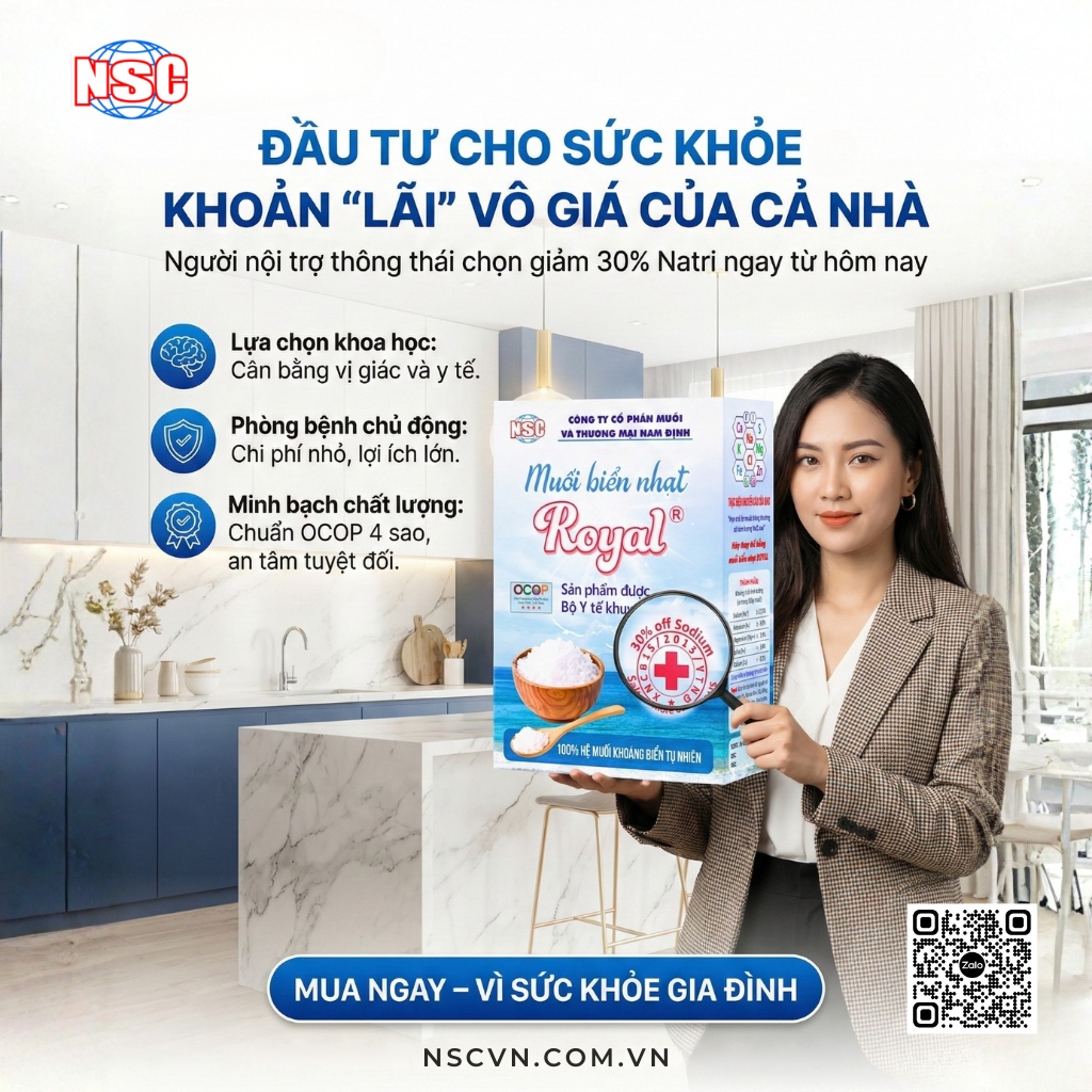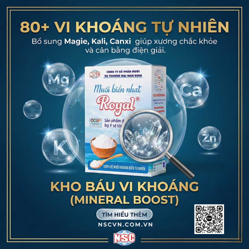 Hãy bảo vệ sức khỏe của bạn và gia đình bạn tốt nhất, hiệu quả nhất không tốn kém mà được bổ sung tới trên 80 vi lượng cần thiết cho cơ thể khi nấu ăn, uống hằng ngày vì muối biển nhạt Royal có Sodium (Na) ít hơn 30% muối thông thường nhưng lại có Potassium (K), Na/K phù hợp tương thích với tế bào mô cơ thể người muối Magnesium (Mg) cao hơn so với muối ăn thông thường giúp gia đình bạn thường xuyên được bổ xung cùng với các vi lượng quý hiếm tự nhiên có trong nước biển để thanh lọc, đào thải độc tố, nâng cao sức đề kháng bền vững cho cơ thể bạn và gia đình hiệu quả nhất.